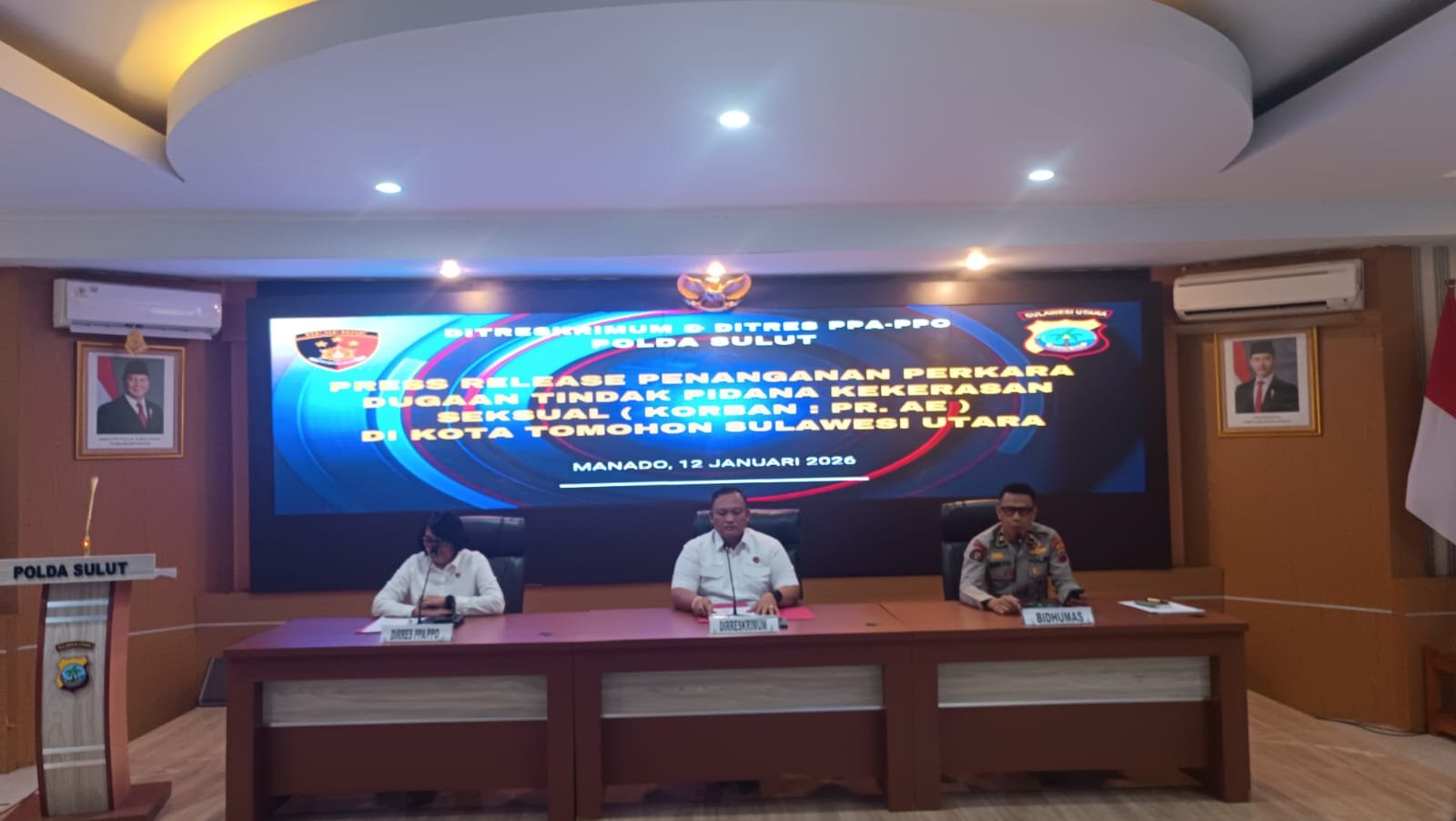 Hal itu ditegaskan Dirreskrimum Polda Sulut Kombes Pol Suryadi dalam konferensi pers di aula Tri Brata Polda Sulut, Senin (12/1/2026) pagi, didampingi Direktur Reserse PPA/PPO Kombes Pol Nonie Sengkey.