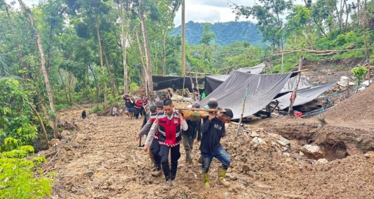 Personel Sabhara Polres Mitra dan Polda Sulut dibantu warga saat mengevakuasi korban