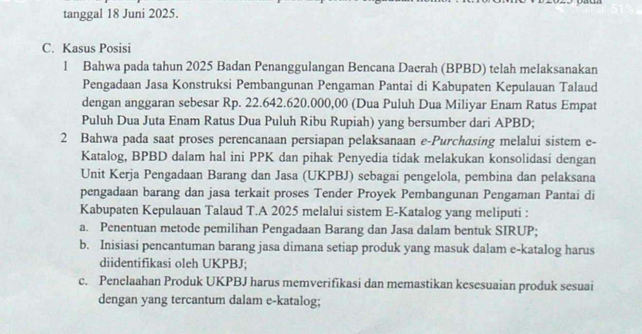 Sementara itu, sesuai dengan PENDAPAT HUKUM yang dikeluarkan Kejari Talaud Nomor: B-923/P.1.17/Gs.1/06/2025 tertanggal 25 Juni 2025, di Bagian (C) KASUS POSISI poin (2), berbunyi: