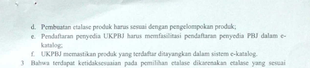 “Itu kan kewenangan, di E-Katalog … itu pe… kalau E-Katalog….. kalau, kalau PPKom (PPK) itu tidak perlu. Karena itu, kalau e… E-Katalog itu seperti penjualan di bukalapak (sala satu penyedia belanja daring). Itu bedanya. Jadi… kalian pahami, itu, kalau dia itu (proyek) mau lelang, lelang biasa.. Itu kita harus ke… UKPBJ. Itu bedanya,” katanya.